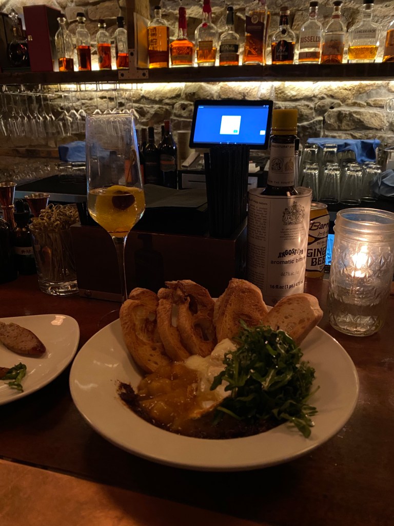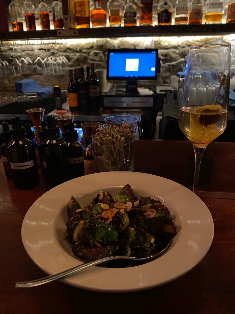 The capacity of this bar is not very large – only the bar and probably ten tables. We sat at the bar which is our normal spot. There were so many great cocktail options as well as a very expansive whiskey selection. I was about to be adventurous but there was a French 75 on the list so I went with my classic fave. Brian ordered a whiskey he liked.