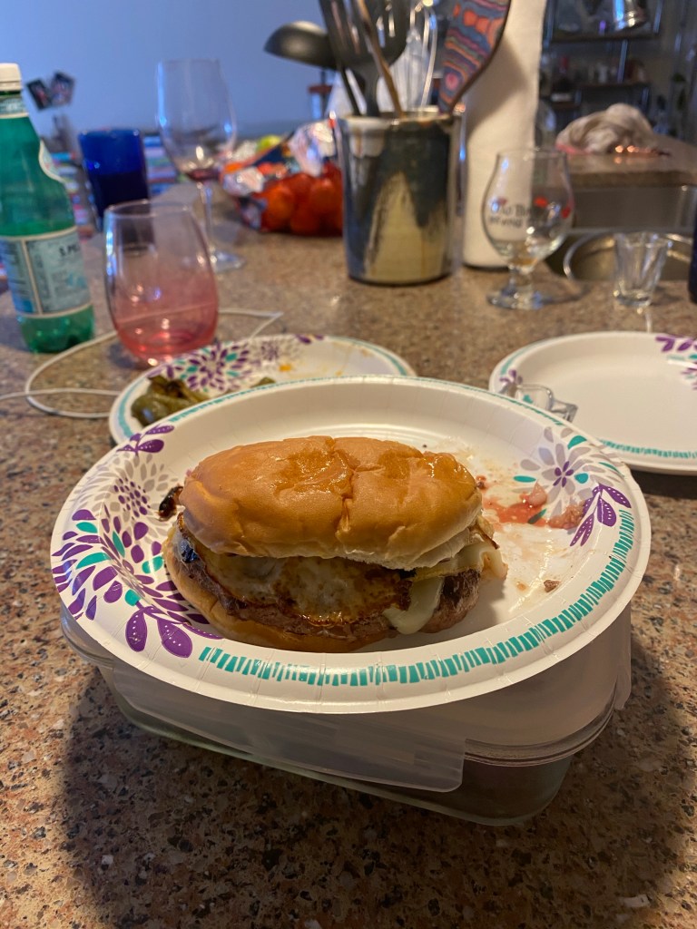 This was not an official Burger Week restaurant but I wanted to include it in the week’s burger list. Brian made this and it was incredible. Costco burger patty, toasted potato bun and toppings include fried egg, onions, Muenster cheese, ketchup and mustard.