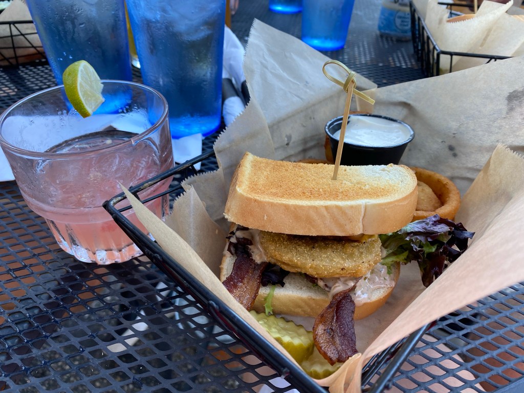 Knoche’s beef patty, rustic white toast, and toppings include bacon, lettuce, fried green tomato, cheddar cheese and housemade tarragon Russian dressing. I’m a huge fan of burgers on toast. And fried green tomatoes! This was also the first place that offered onion rings as the side which we were stoked about.