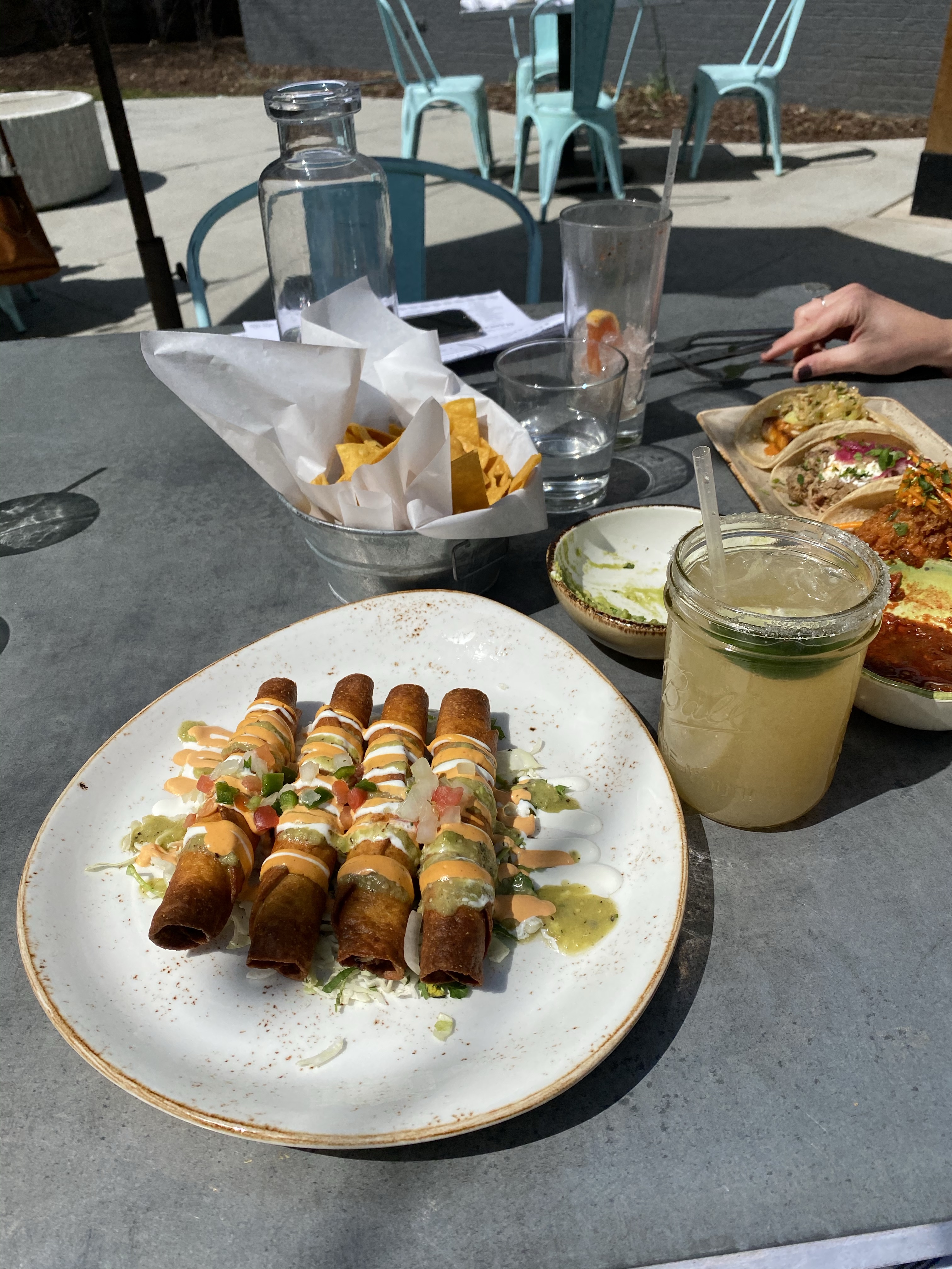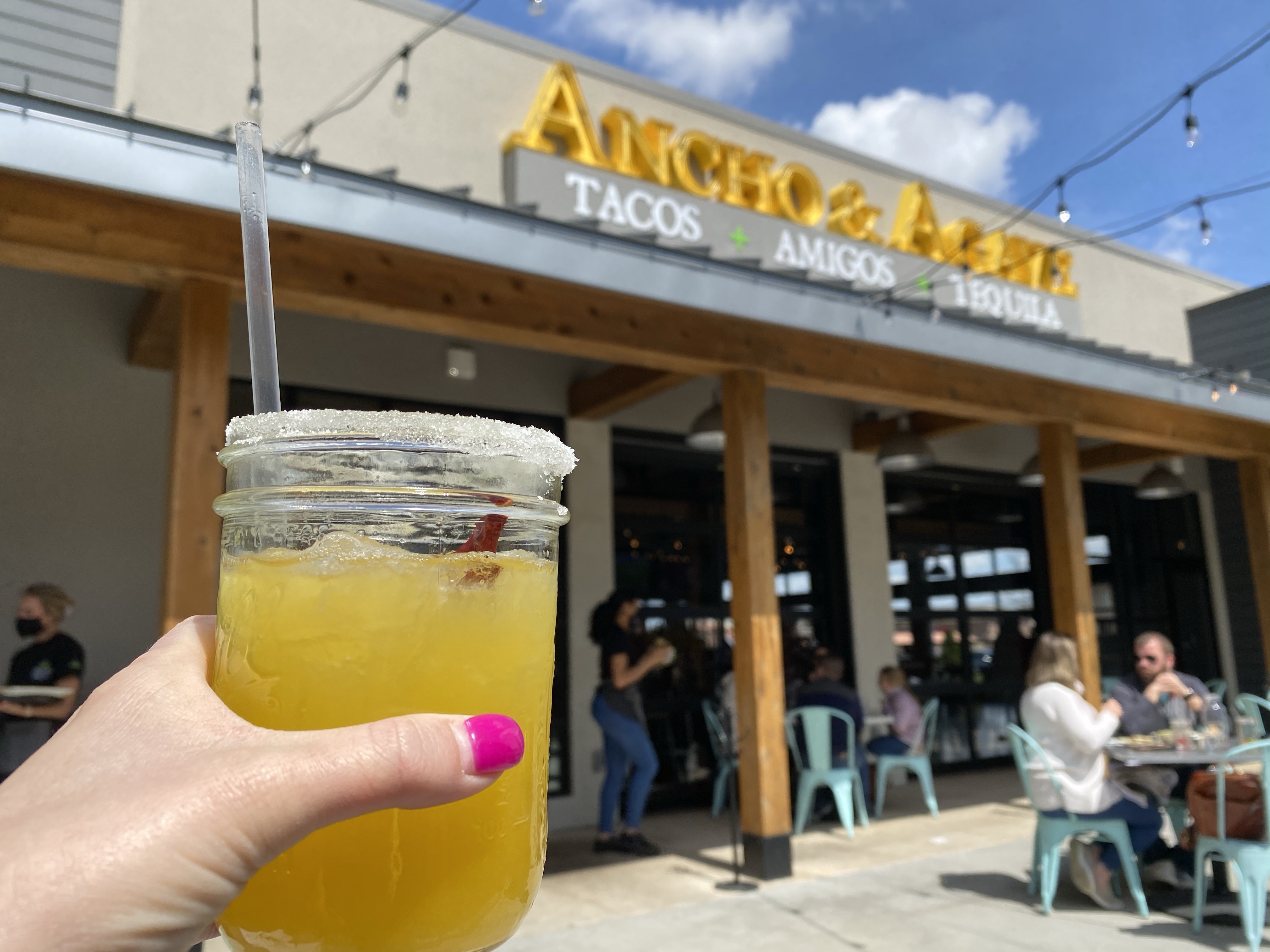 Ancho and Agave. This is a cute Mexican spot in Middleton with a big outdoor space. It was one of the first warm days of the season so my friend and I wanted to take advantage! We got the chips and guac plus the complimentary salsa. I drank a couple delicious margaritas to drink!