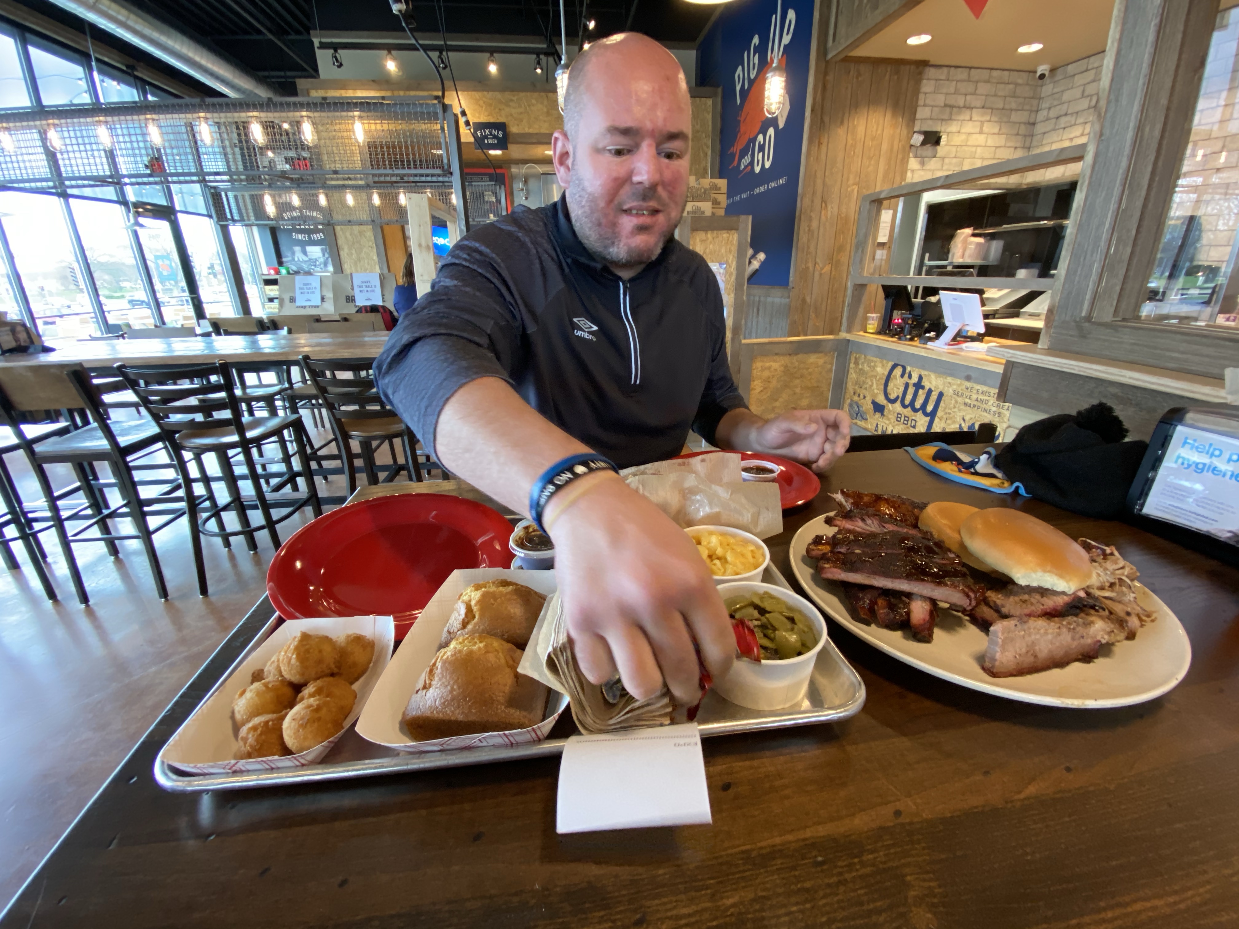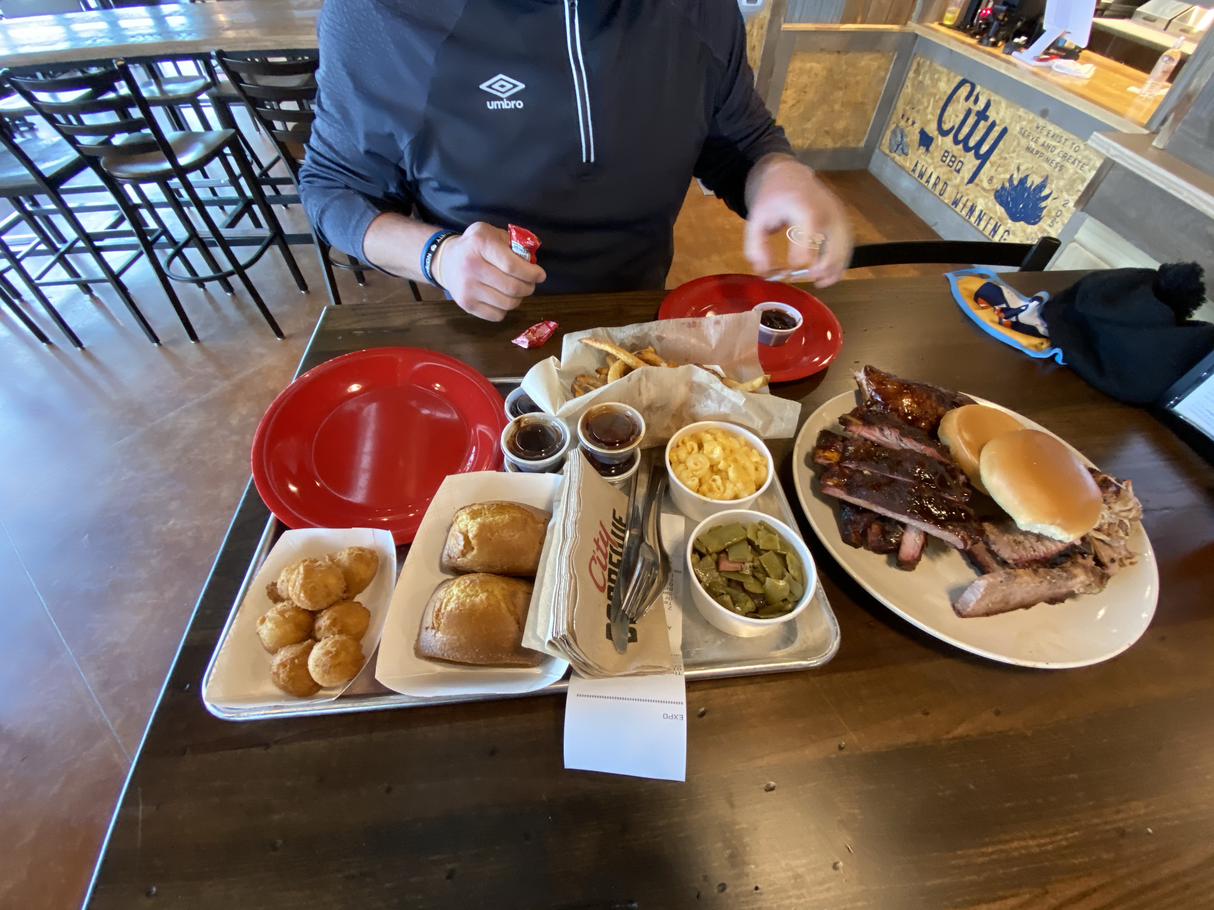 City Barbecue. This restaurant has recently opened on the West Side. We went all out and definitely over ordered but it all good. The Judge’s Sample included a quarter chicken, half slab of ribs, pulled pork, beef brisket, two sides, two pieces of cornbread, and Texas toast. For sides we got fries, green beans, hushpuppies and mac and cheese.