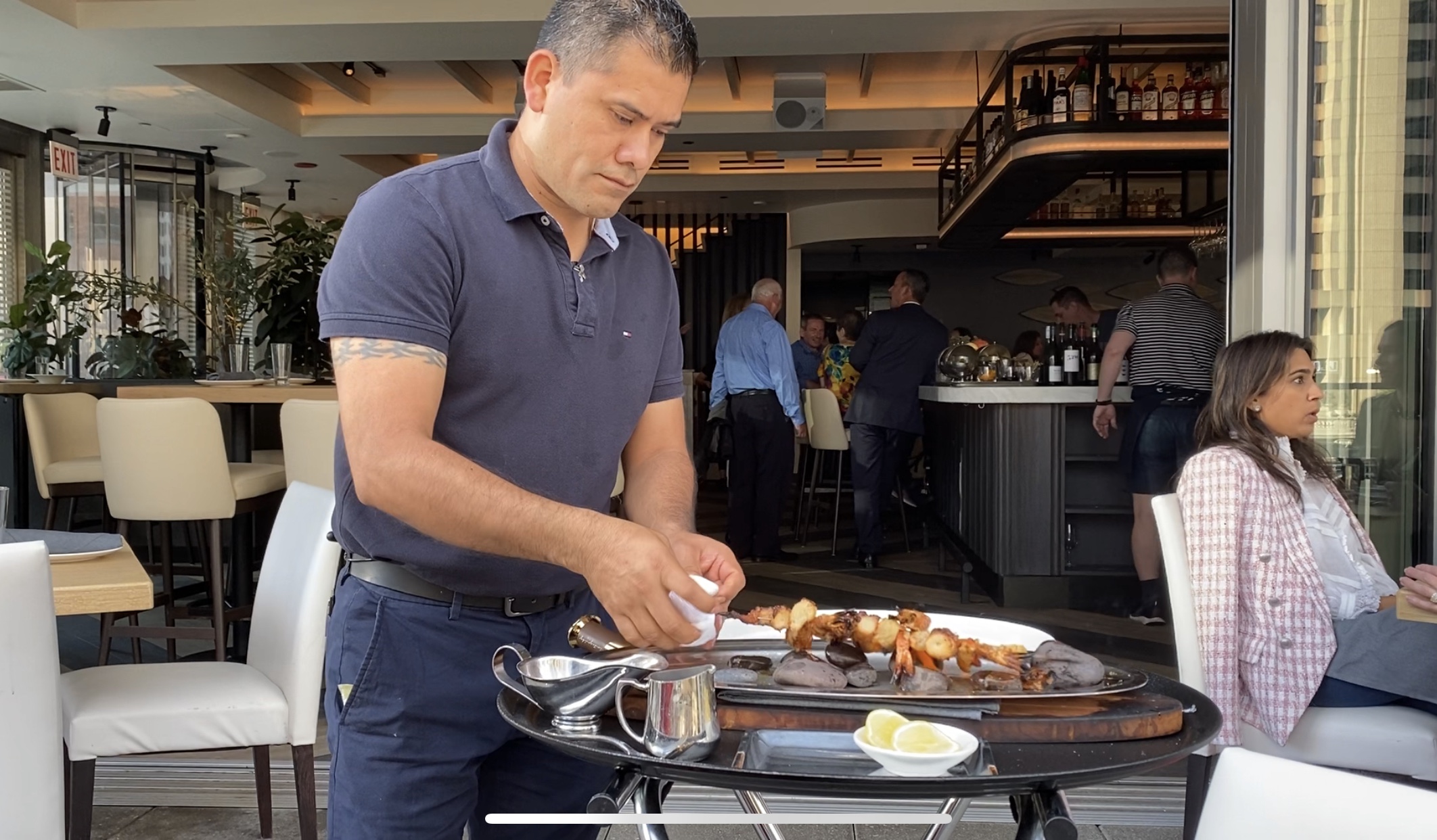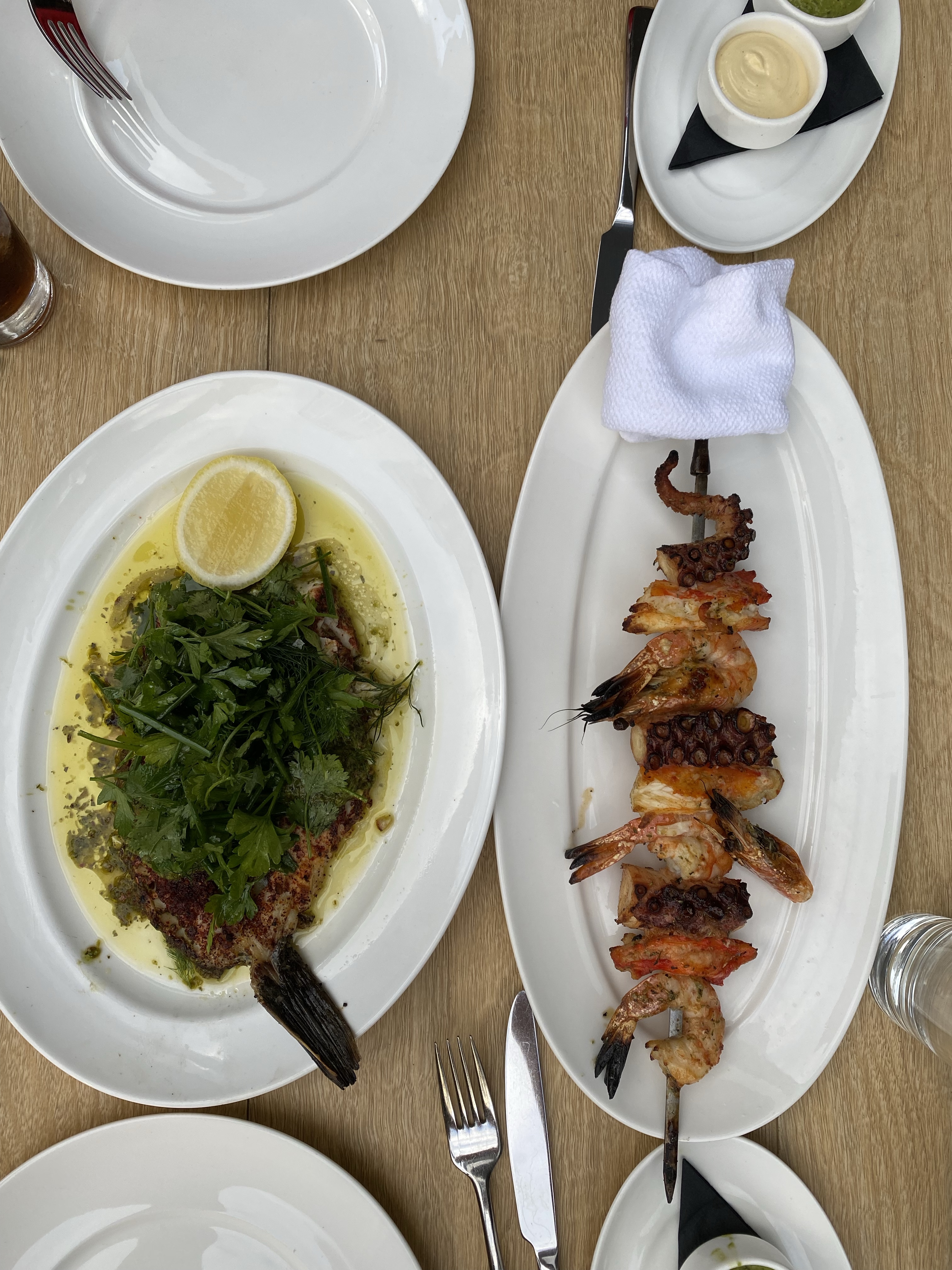 Food wise, we shared everything. We got oysters and a caesar salad to start. The oysters came with lemon ice which was an intriguing touch. On the salad, the crouton aspect started out as a crispy block of bread. We debated on going with the cold seafood tower but instead went the direction of the mixed grill. The RPM Seafood Mixed Grill includes King Crab, Spanish Octopus, and Blue Prawn. Upon delivery the dish is flamed table-side. It was cooked perfectly and the flavor of all the meats was incredible. We also loved the dipping sauces that came with the meal. For another dish we asked our server Jake for a recommendation and he said the Charcoal-Grilled Black Bass which is served with Moroccan Spices and Salsa Verde. I don’t usually love fish dishes but this one blew my mind. The flavor profile was well balanced with the bright taste of the salsa paired with the charred fish.